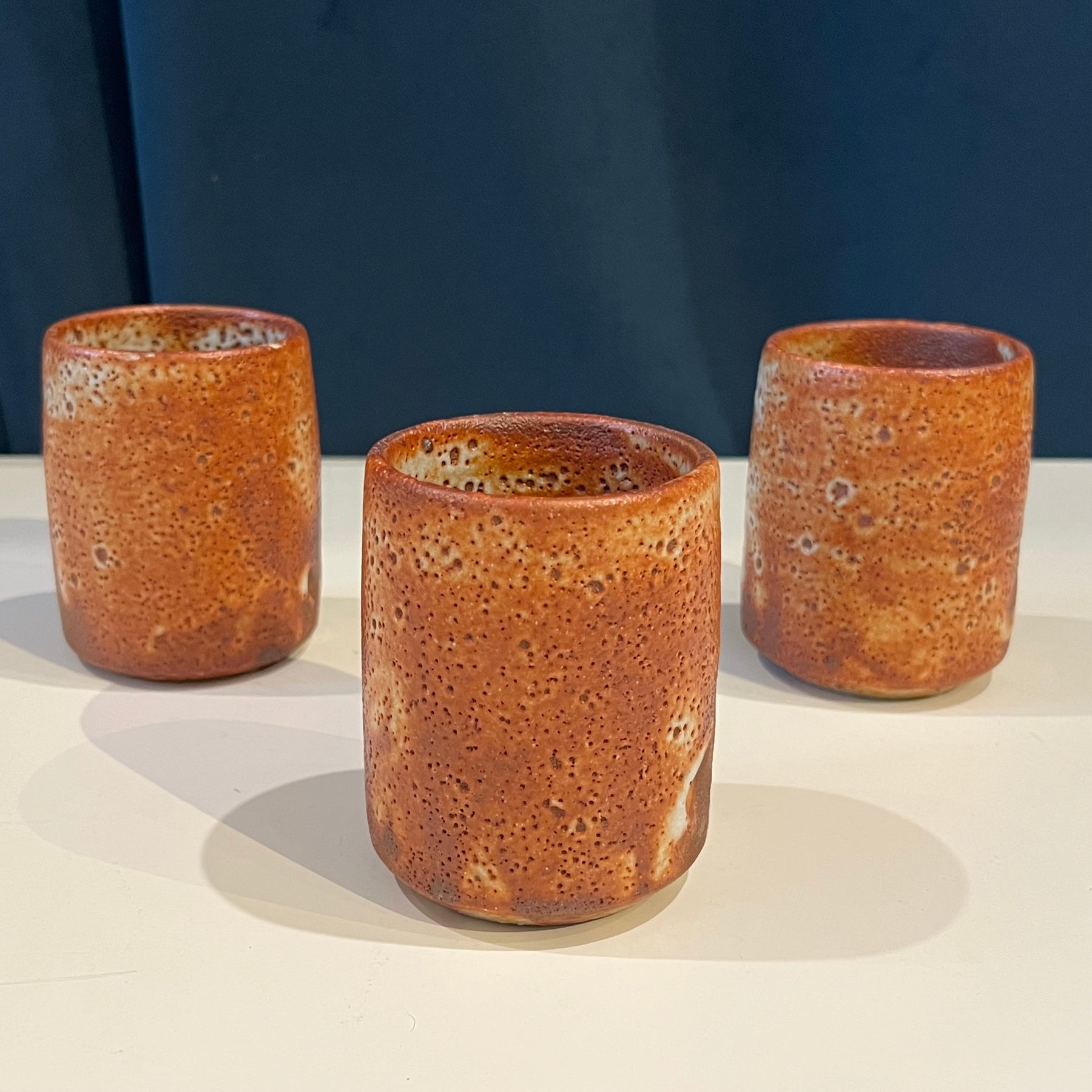 1960s-era Japanese ceramic Shino ware cups of a darker orange-brown. Marked underneath with a dot in a circle. Two of the cups have one tiny chip on the rim.