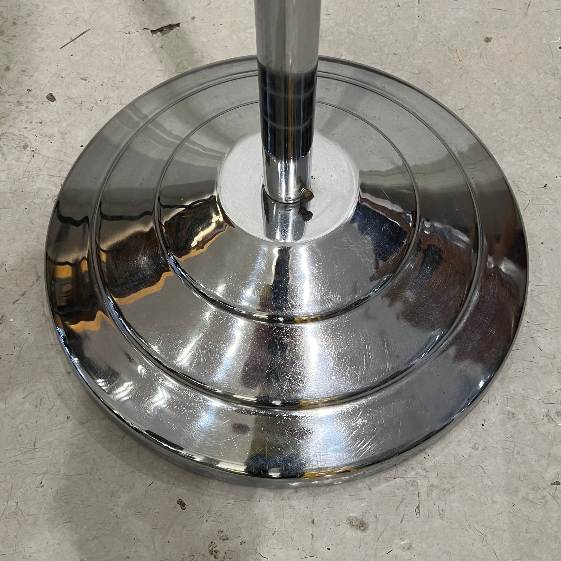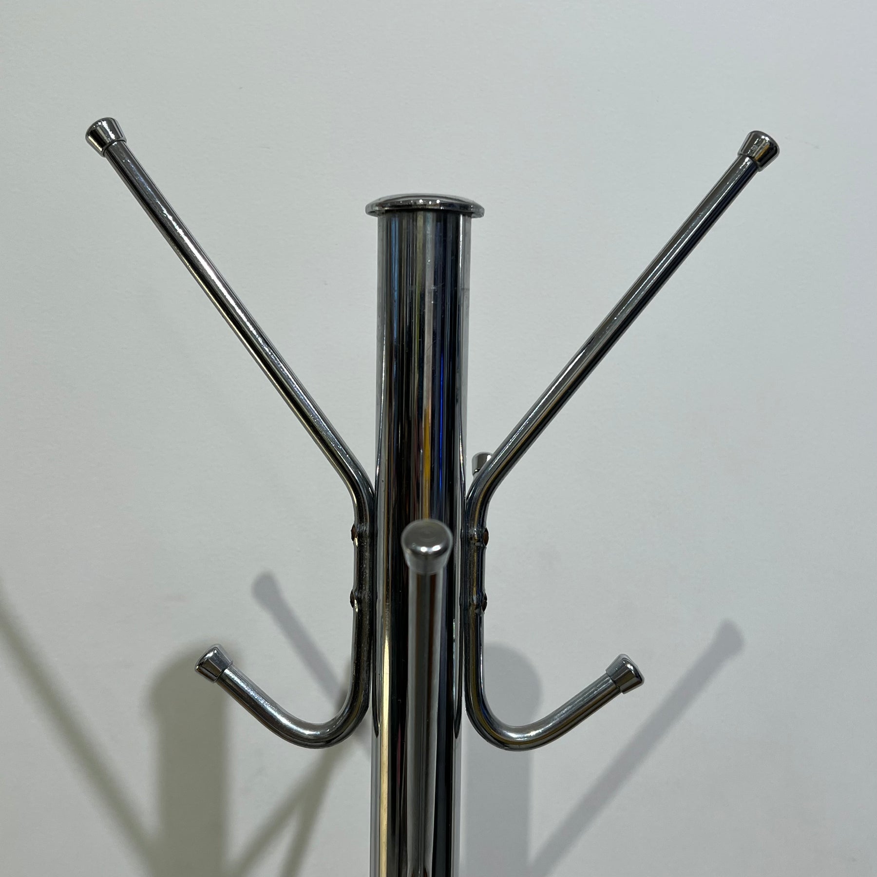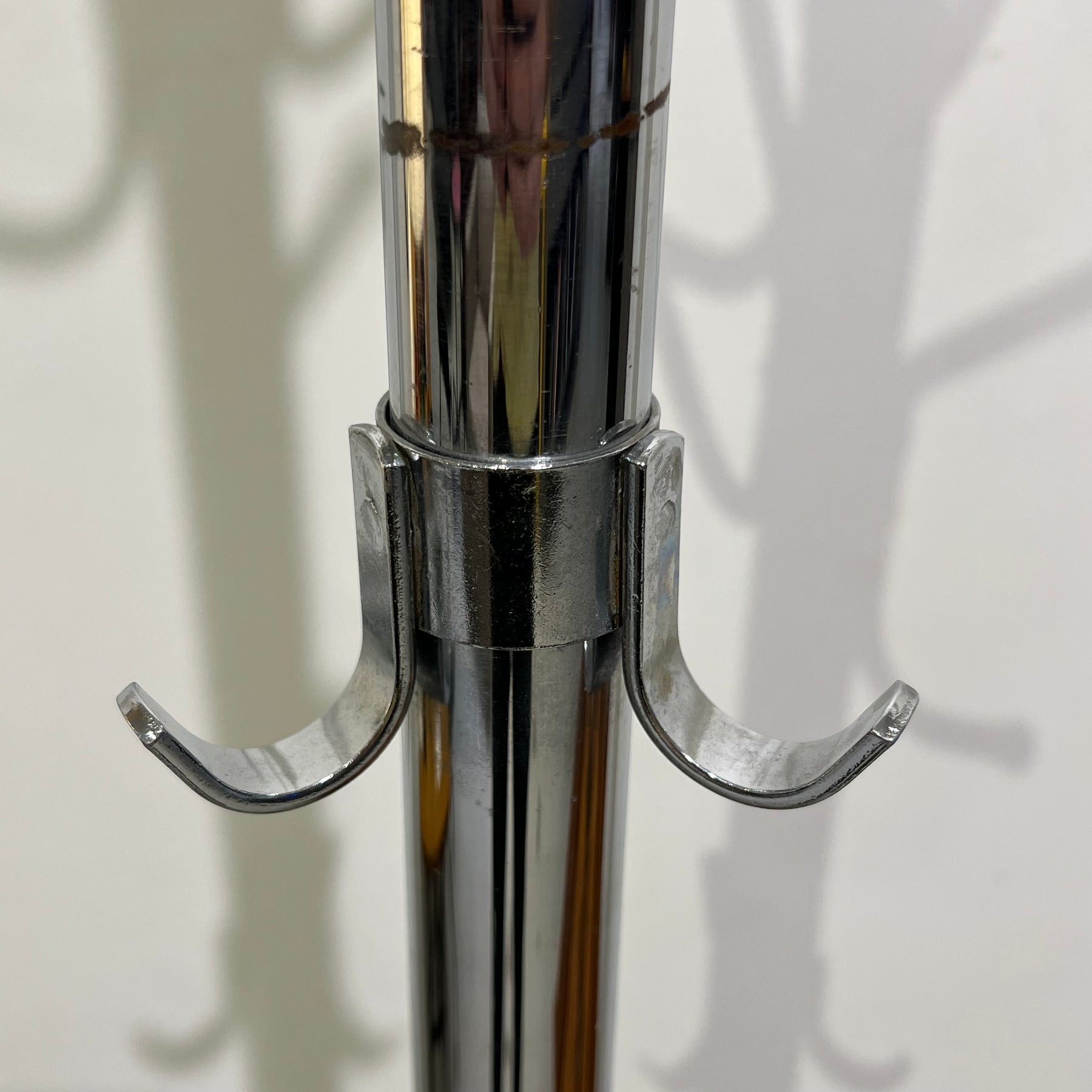 Vintage classic deco-style chrome coat tree. Features four 2-prong hooks and one spinning 3-hook collar below for umbrellas and bags.