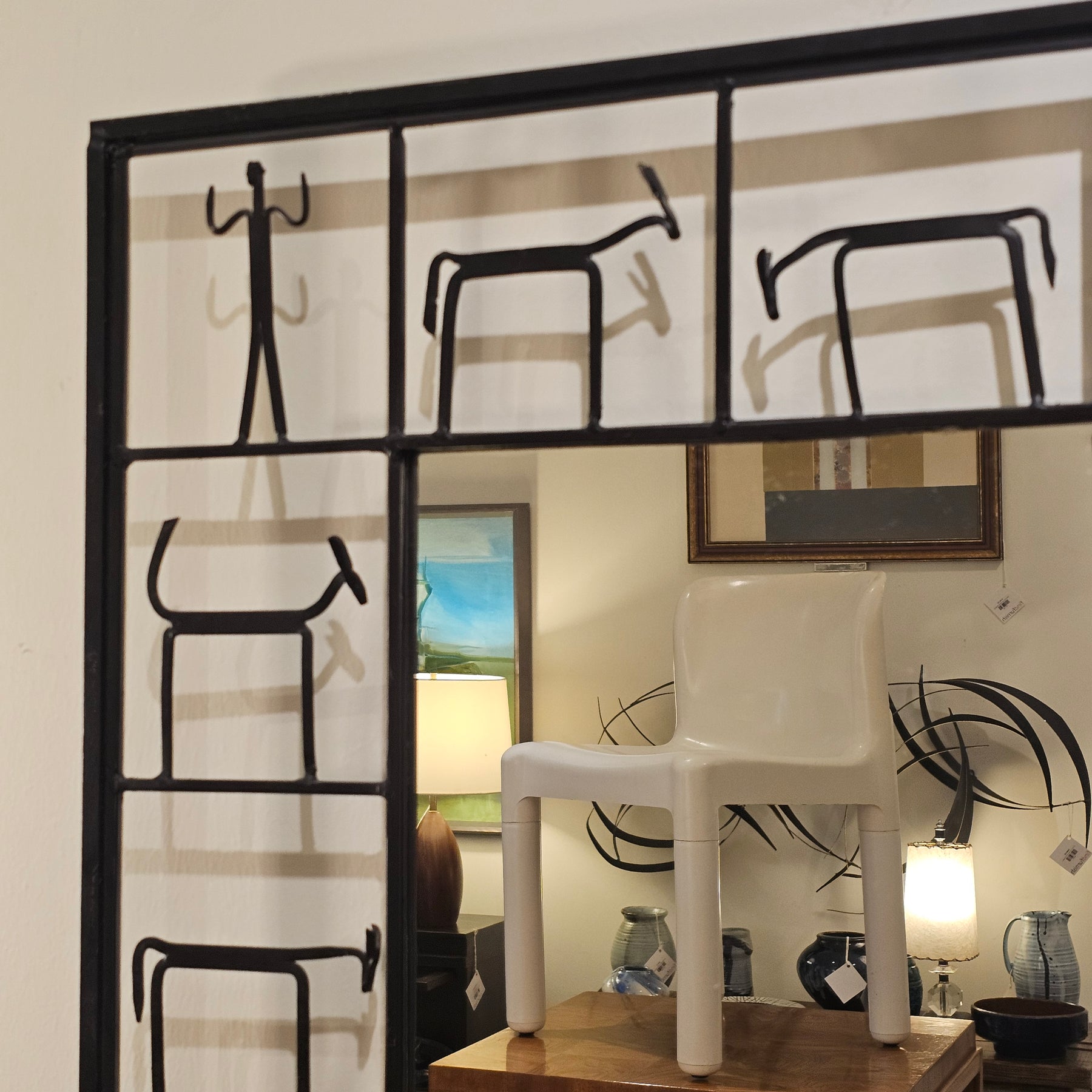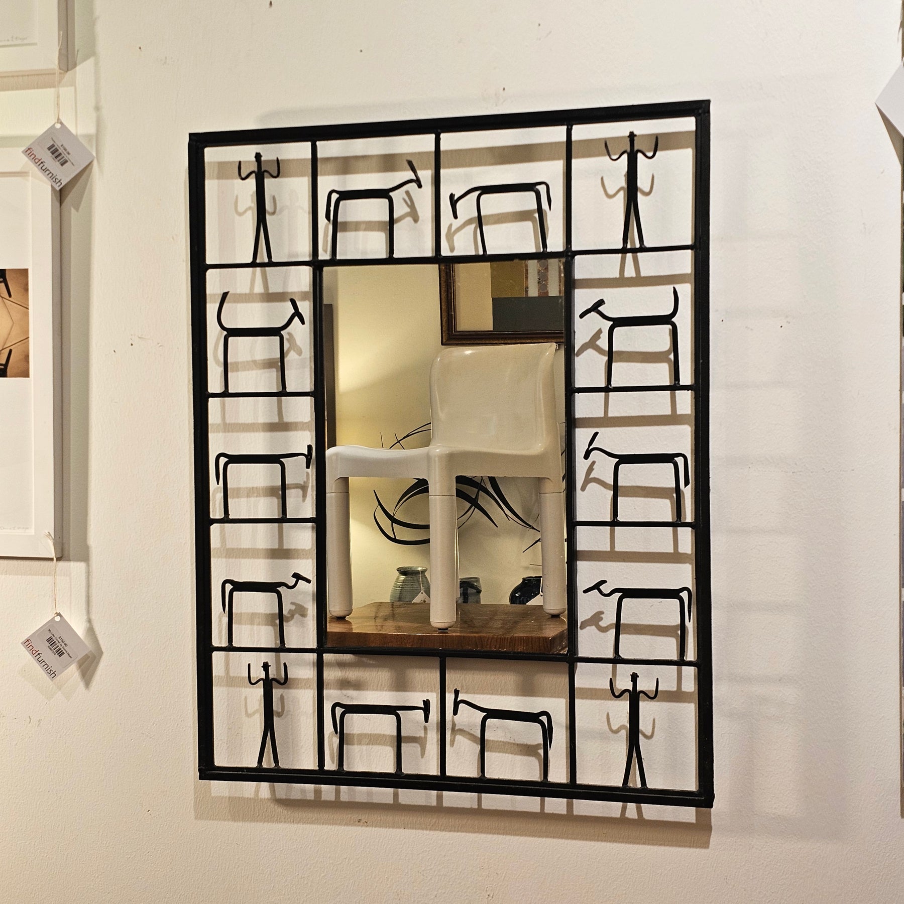 Brutalist iron mirror, with figural motif, styled after Frederic Weinberg.