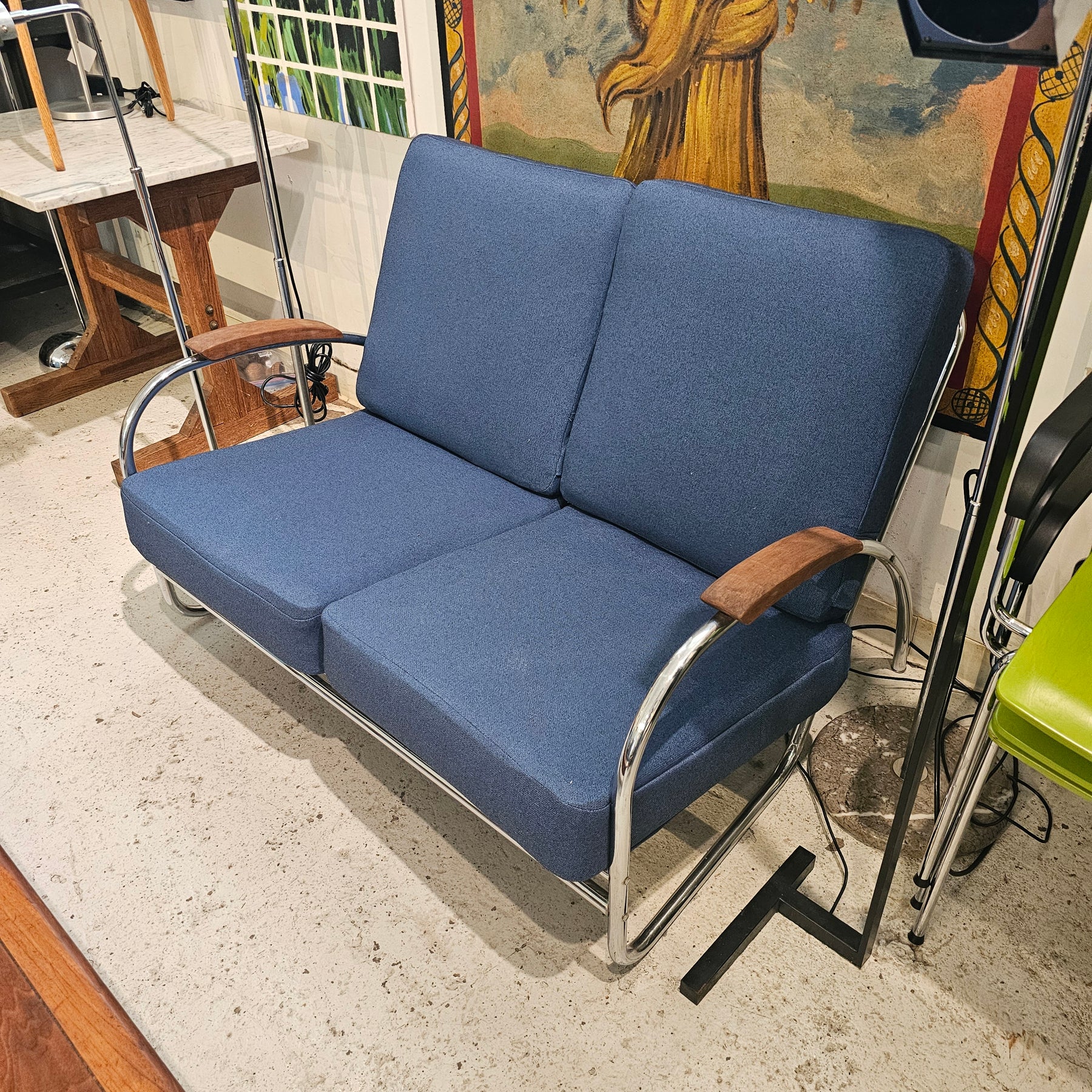 Machine Age Loveseat. In the style of K.E.M. Weber. Great overall condition for age, with newer upholstery.