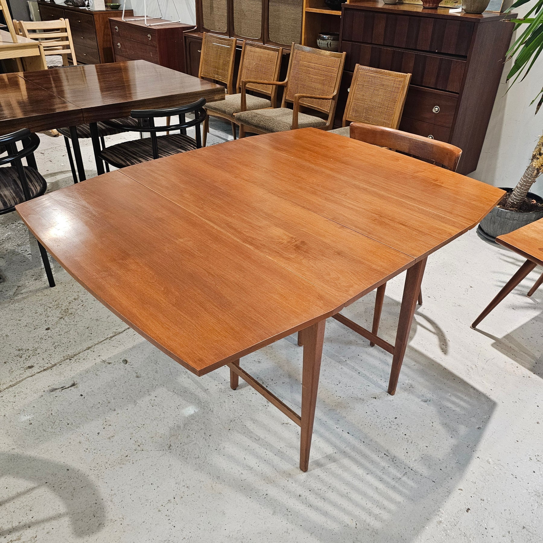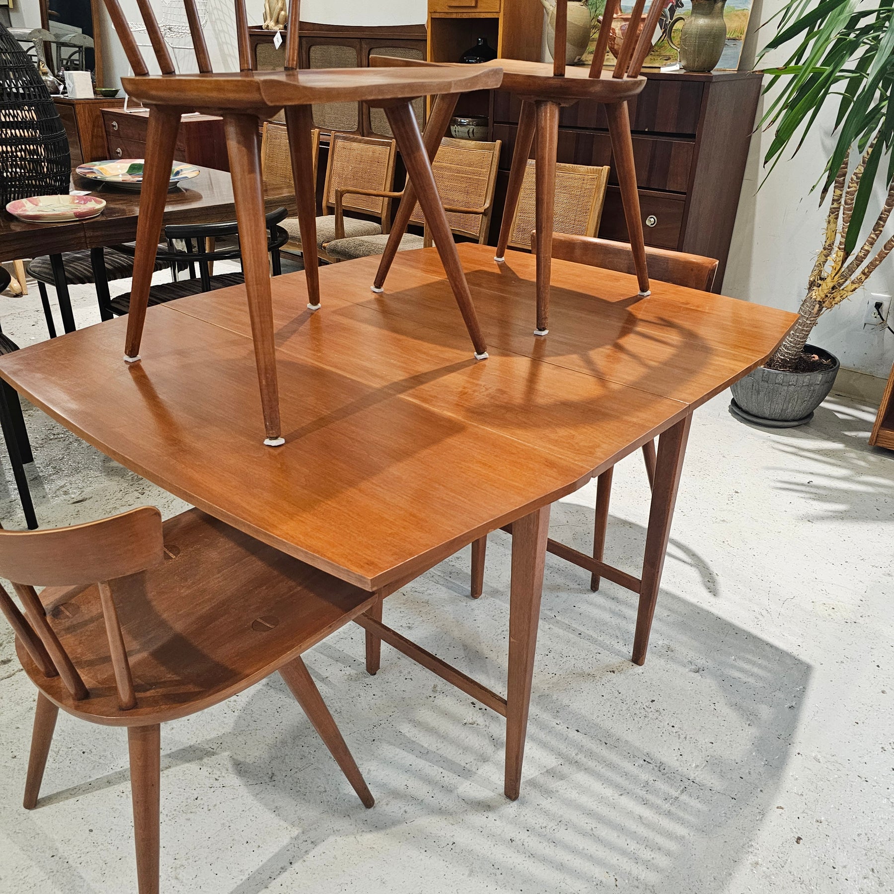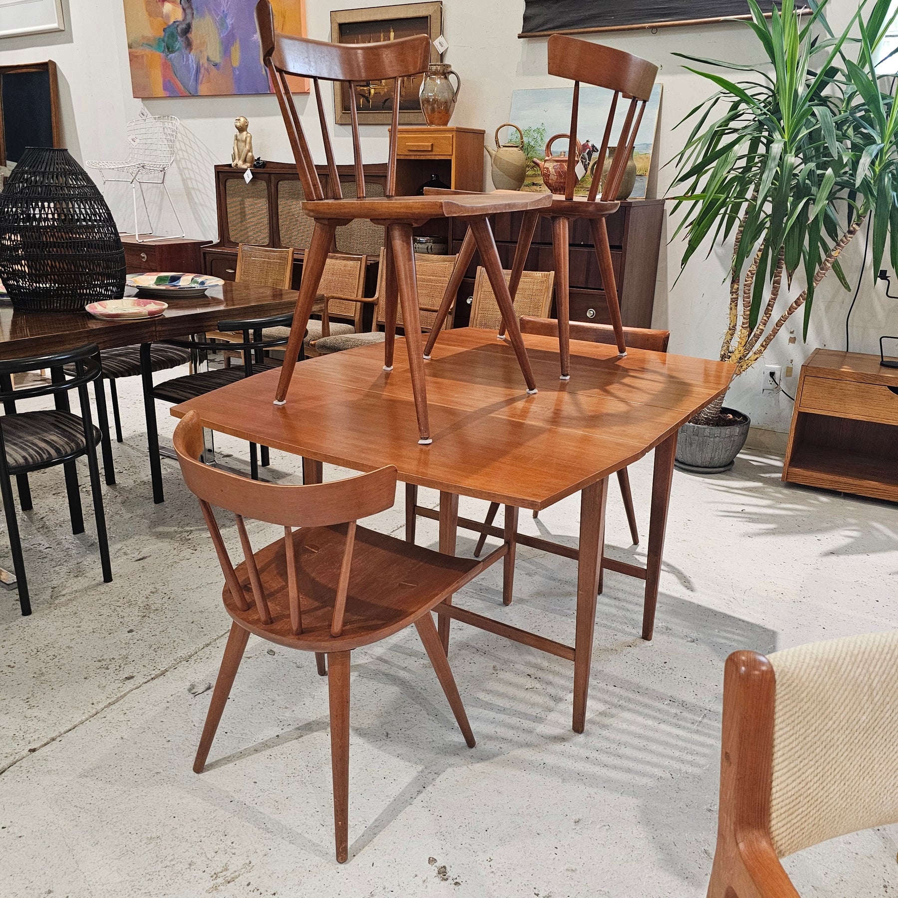 This Paul McCobb Planner Group dining set, crafted in the 1950s by Winchendon Furniture, features a versatile solid maple drop-leaf table and four matching chairs with McCobb’s signature screw-top seats and sculpted backrests. The clean, minimalist lines and warm maple finish exemplify mid-century modern design, while the drop-leaf functionality allows the table to transition easily from a compact footprint to full dining capacity. The set is in overall good vintage condition, structurally sound with light wear consistent with age, making it both a practical and iconic addition to any dining space.