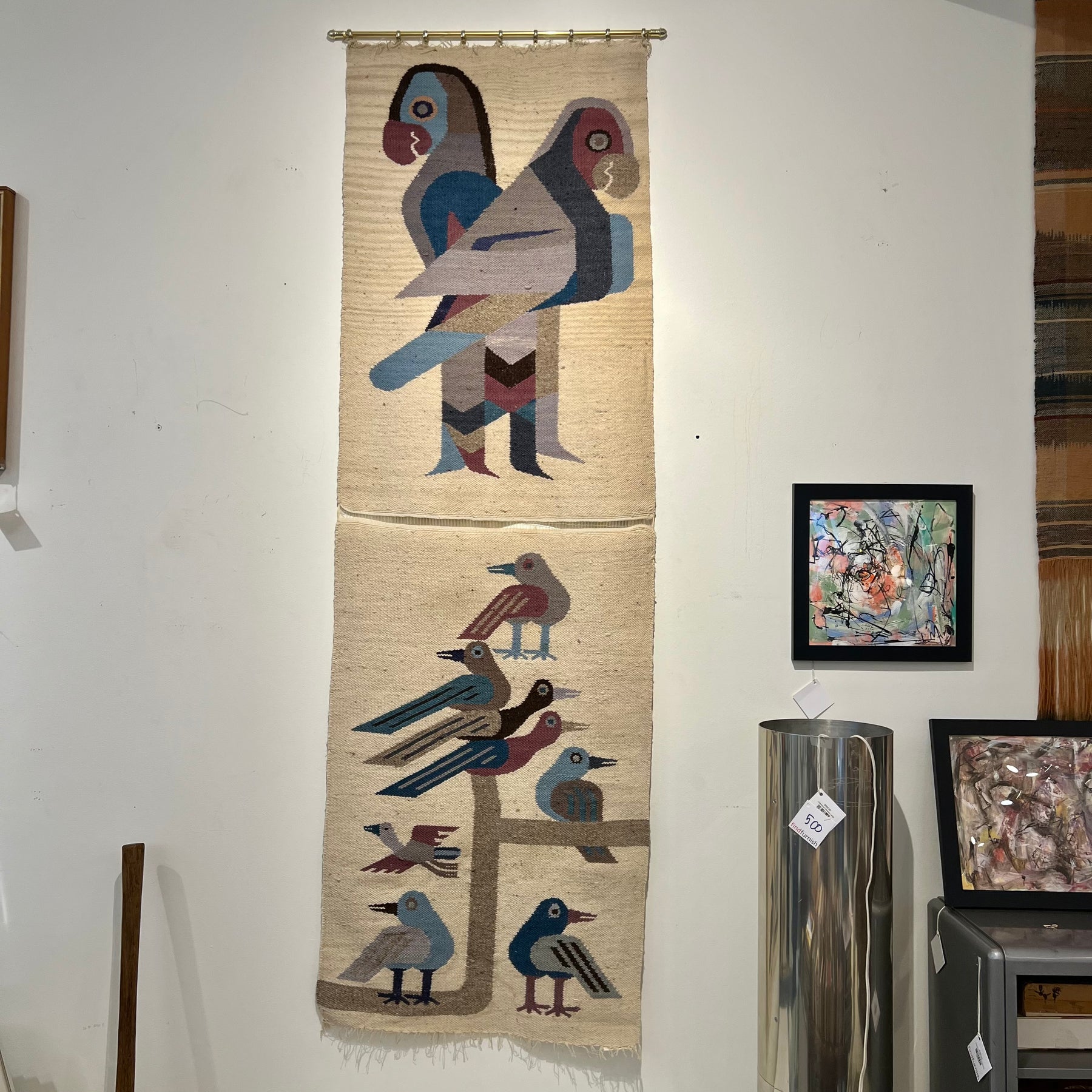 Large contemporary Ecuadorian wool wall tapestry of various birds in a pastel palette. Brass hanging rod.