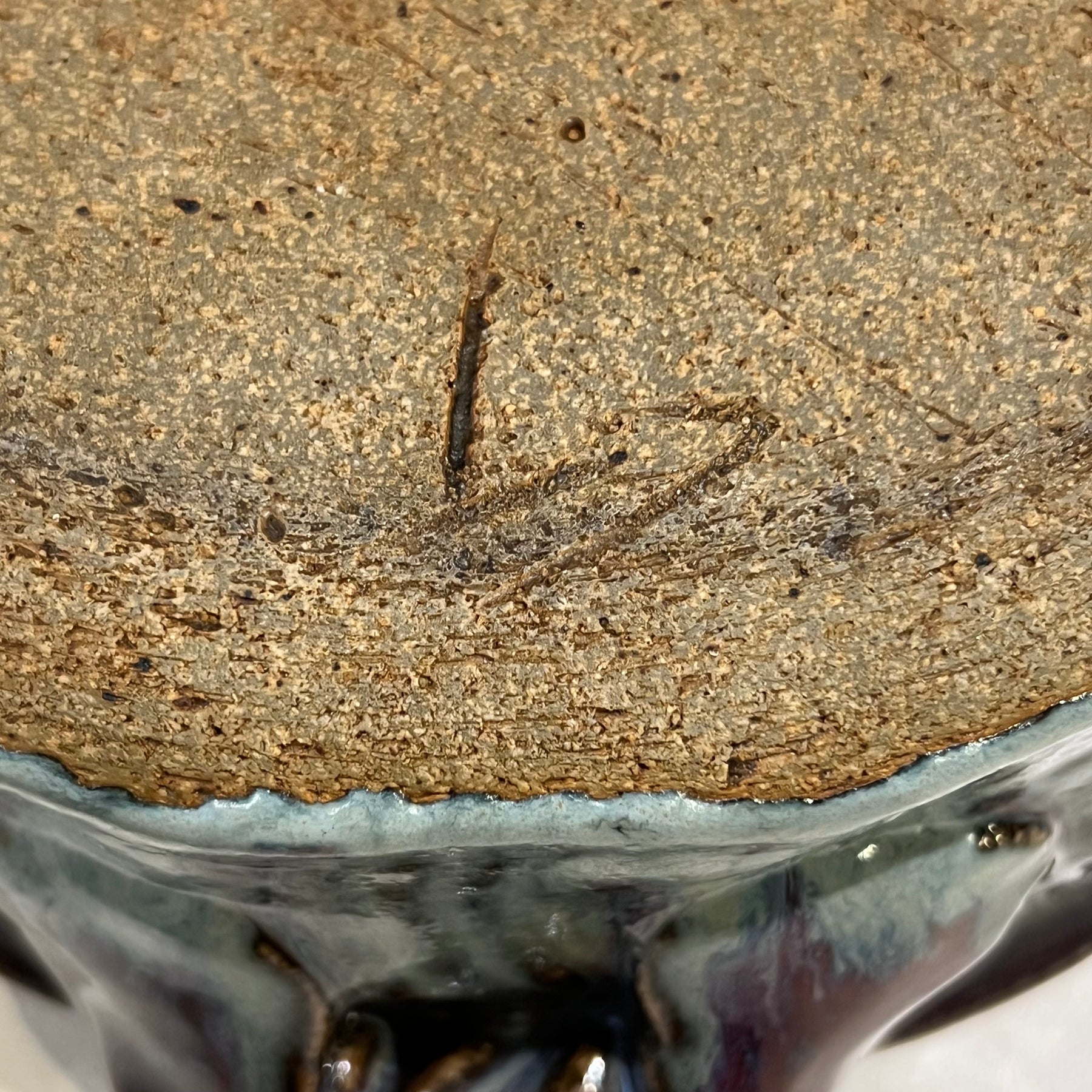 Beautifully made lidded ceramic pot with a plummy purple top and a turquoise-blue base. Signed what appears be “L7”.