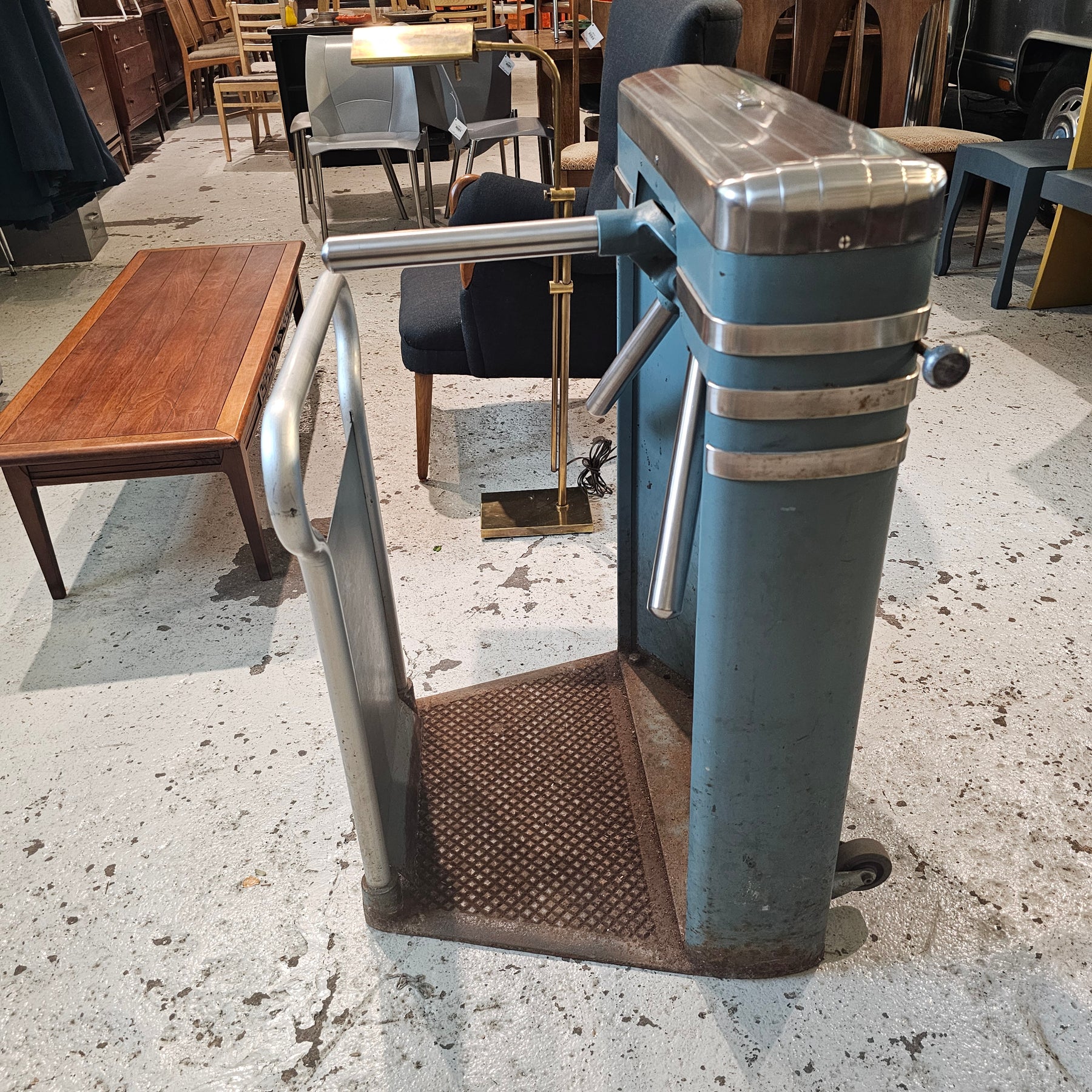 Constructed in heavy-duty steel with a teal blue, utilitarian finish, the turnstile retains its original patina and working mechanism, reflecting years of service and character. Perfect as a statement piece in a retail or hospitality setting, or as a sculptural accent for an eclectic industrial interior.